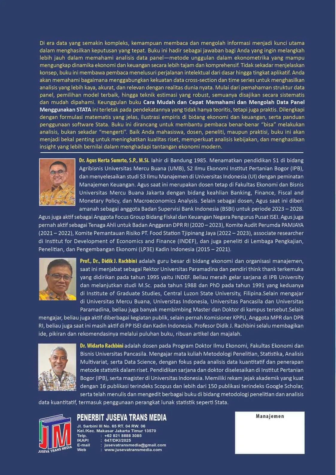 Di era data yang semakin kompleks, kemampuan membaca dan mengolah informasi menjadi kunci utama dalam menghasilkan keputusan yang tepat. Buku ini hadir sebagai jawaban bagi Anda yang ingin melangkah lebih jauh dalam memahami analisis data panel—metode unggulan dalam ekonometrika yang mampu mengungkap dinamika ekonomi dan keuangan secara lebih tajam dan komprehensif. Tidak sekadar menjelaskan konsep, buku ini membawa pembaca menelusuri perjalanan intelektual dari dasar hingga tingkat aplikatif. Anda akan memahami bagaimana menggabungkan kekuatan data cross-section dan time series untuk menghasilkan analisis yang lebih kaya, akurat, dan relevan dengan realitas dunia nyata. Mulai dari pemahaman struktur data panel, pemilihan model terbaik, hingga teknik estimasi yang robust, semuanya disajikan secara sistematis dan mudah dipahami. Keunggulan buku Cara Mudah dan Cepat Memahami dan Mengolah Data Panel Menggunakan STATA ini terletak pada pendekatannya yang tidak hanya teoritis, tetapi juga praktis. Dilengkapi dengan formulasi matematis yang jelas, ilustrasi empiris di bidang ekonomi dan keuangan, serta panduan penggunaan software Stata. Buku ini dirancang untuk membantu pembaca benar-benar “bisa” melakukan analisis, bukan sekadar “mengerti”. Baik Anda mahasiswa, dosen, peneliti, maupun praktisi, buku ini akan menjadi bekal penting untuk meningkatkan kualitas riset, memperkuat analisis kebijakan, dan menghasilkan insight yang lebih bernilai dalam menghadapi tantangan ekonomi modern.