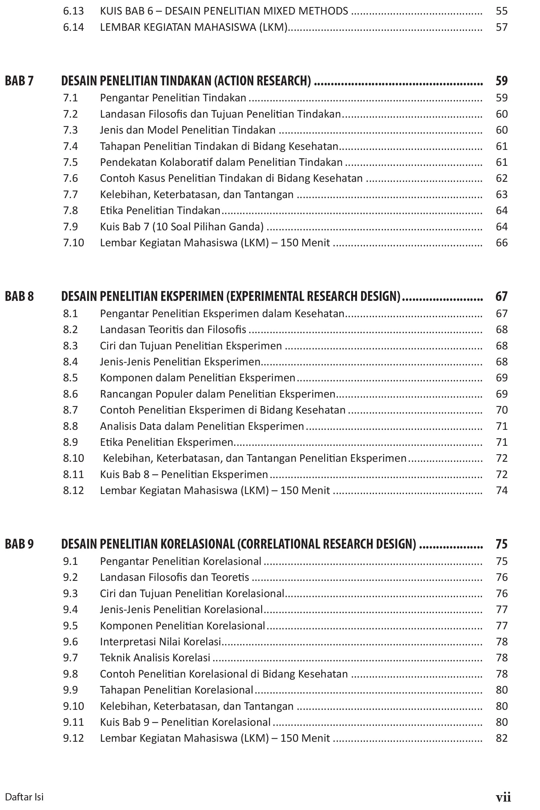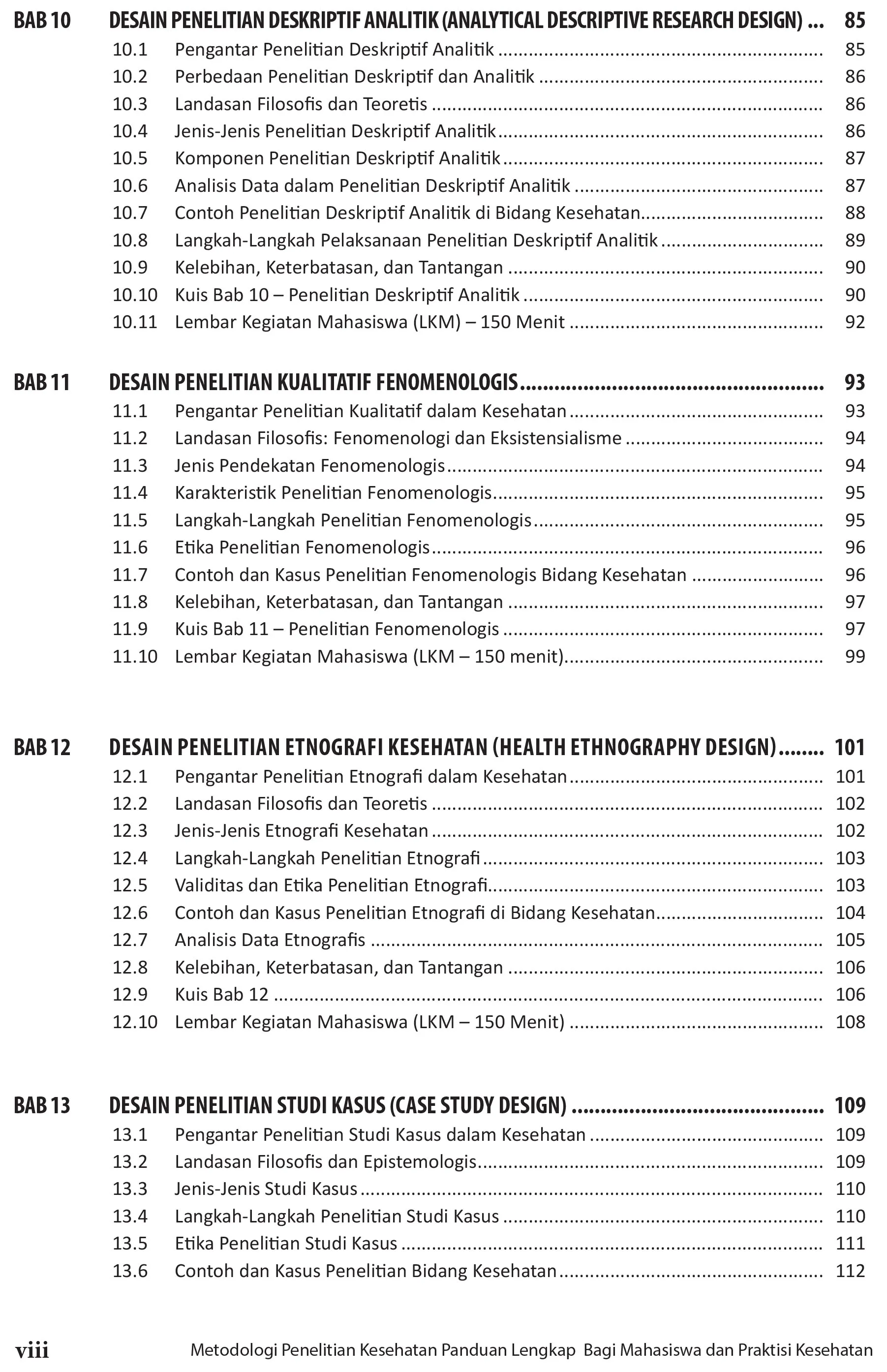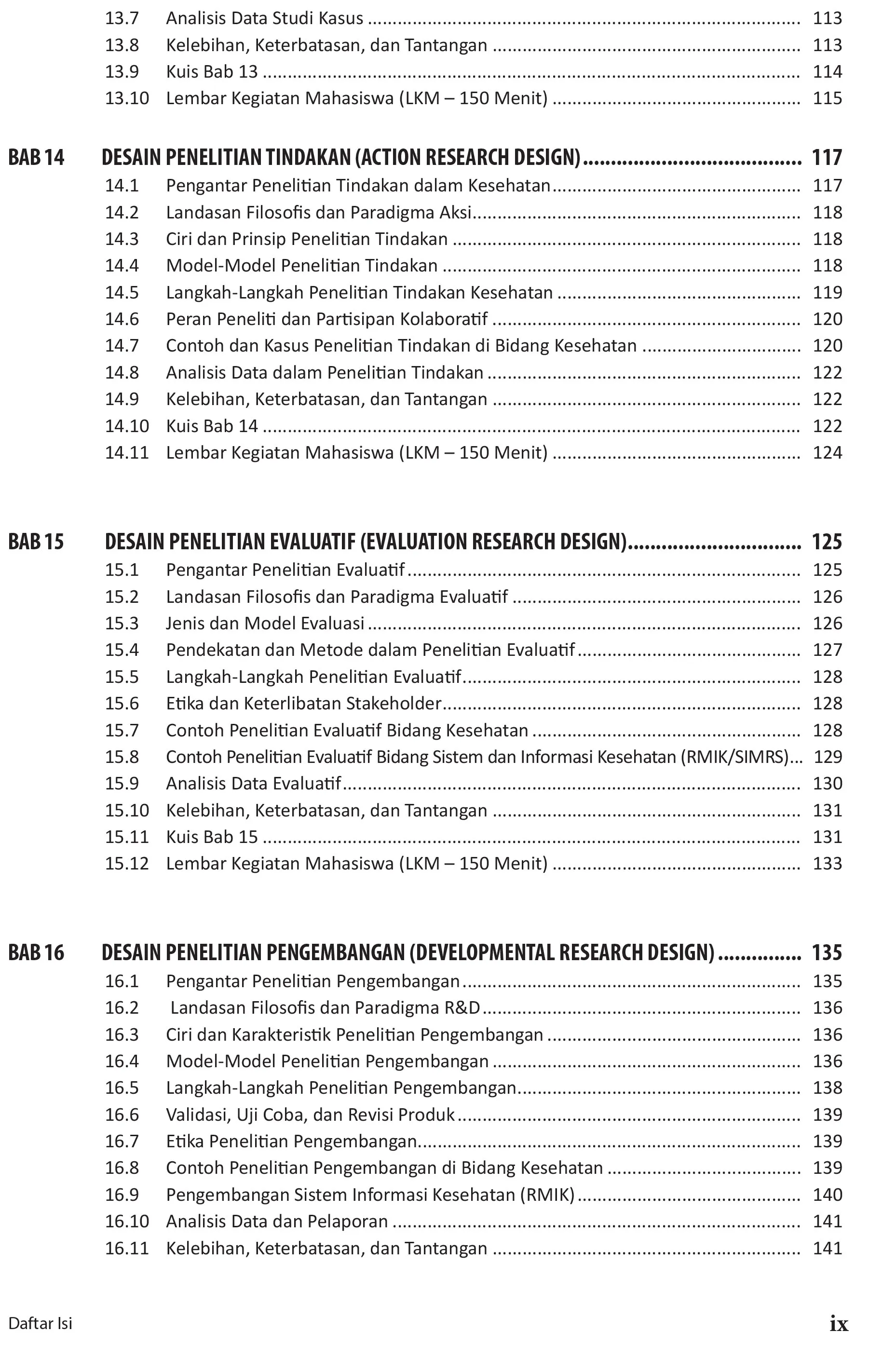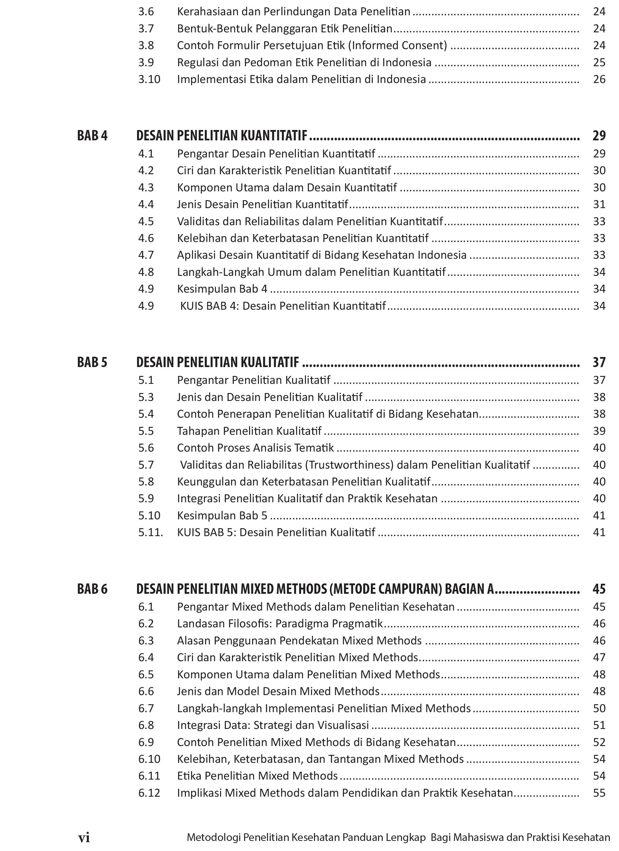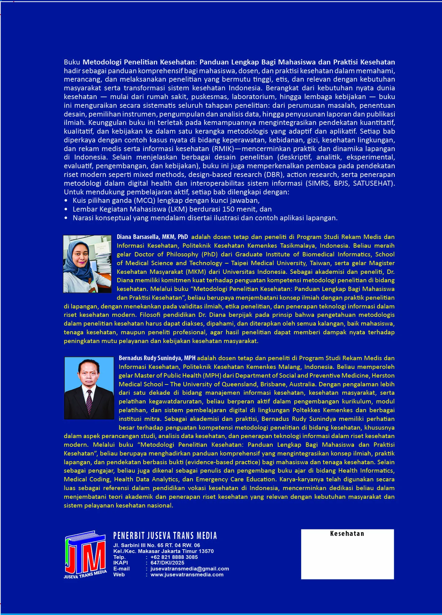Buku Metodologi Penelitian Kesehatan: Panduan Lengkap Bagi Mahasiswa dan Praktisi Kesehatan hadir sebagai panduan komprehensif bagi mahasiswa, dosen, dan praktisi kesehatan dalam memahami, merancang, dan melaksanakan penelitian yang bermutu tinggi, etis, dan relevan dengan kebutuhan masyarakat serta transformasi sistem kesehatan Indonesia. Berangkat dari kebutuhan nyata dunia kesehatan — mulai dari rumah sakit, puskesmas, laboratorium, hingga lembaga kebijakan — buku ini menguraikan secara sistematis seluruh tahapan penelitian: dari perumusan masalah, penentuan desain, pemilihan instrumen, pengumpulan dan analisis data, hingga penyusunan laporan dan publikasi ilmiah. Keunggulan buku ini terletak pada kemampuannya mengintegrasikan pendekatan kuantitatif, kualitatif, dan kebijakan ke dalam satu kerangka metodologis yang adaptif dan aplikatif. Setiap bab diperkaya dengan contoh kasus nyata di bidang keperawatan, kebidanan, gizi, kesehatan lingkungan, dan rekam medis serta informasi kesehatan (RMIK)—mencerminkan praktik dan dinamika lapangan di Indonesia. Selain menjelaskan berbagai desain penelitian (deskriptif, analitik, eksperimental, evaluatif, pengembangan, dan kebijakan), buku ini juga memperkenalkan pembaca pada pendekatan riset modern seperti mixed methods, design-based research (DBR), action research, serta penerapan metodologi dalam digital health dan interoperabilitas sistem informasi (SIMRS, BPJS, SATUSEHAT). Untuk mendukung pembelajaran aktif, setiap bab dilengkapi dengan: