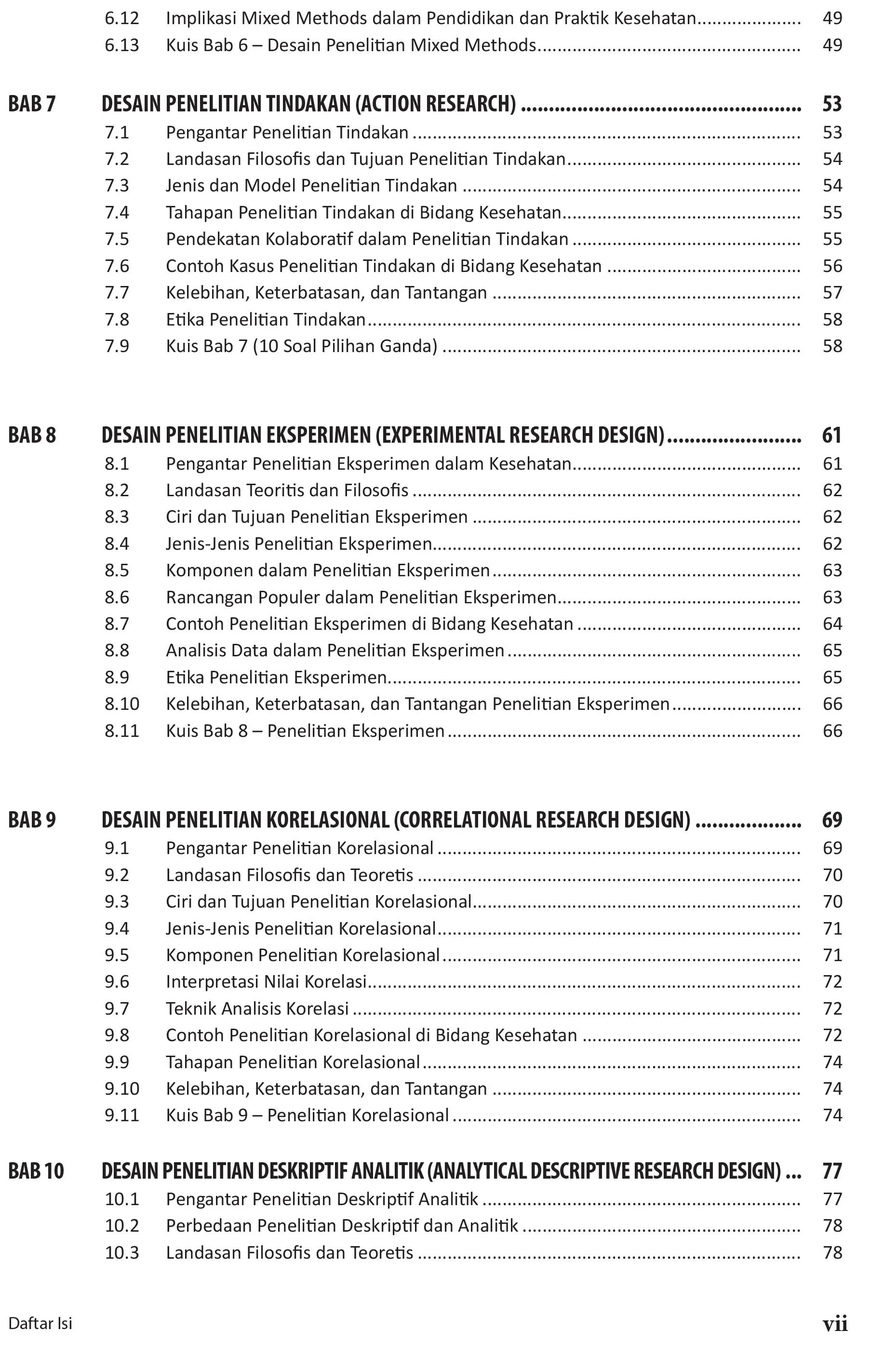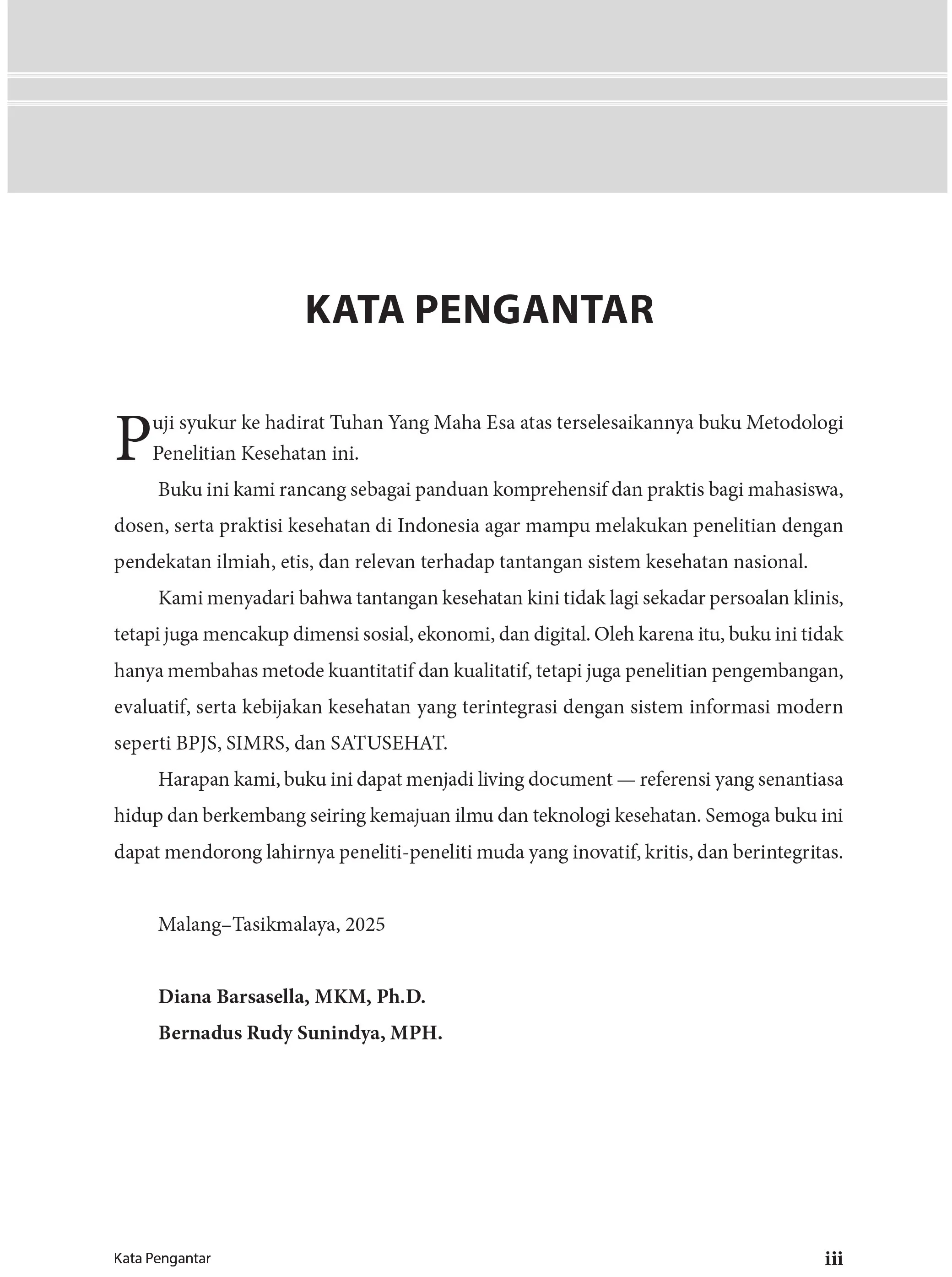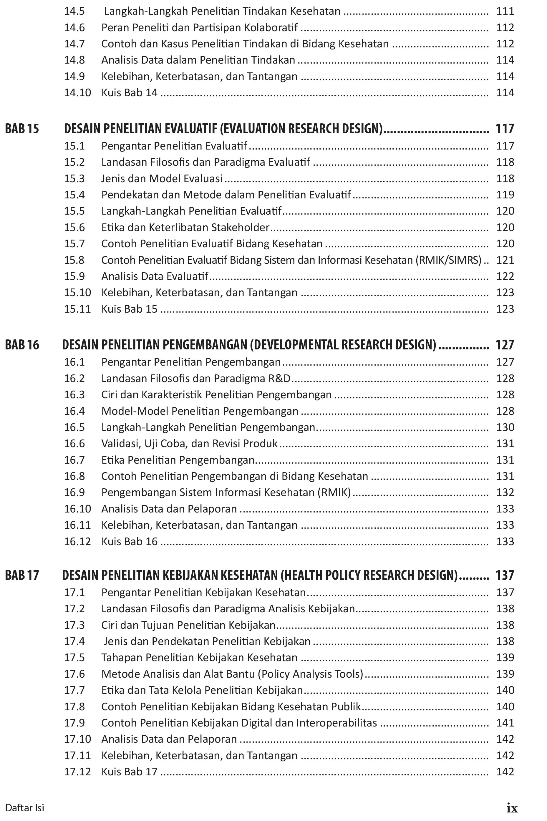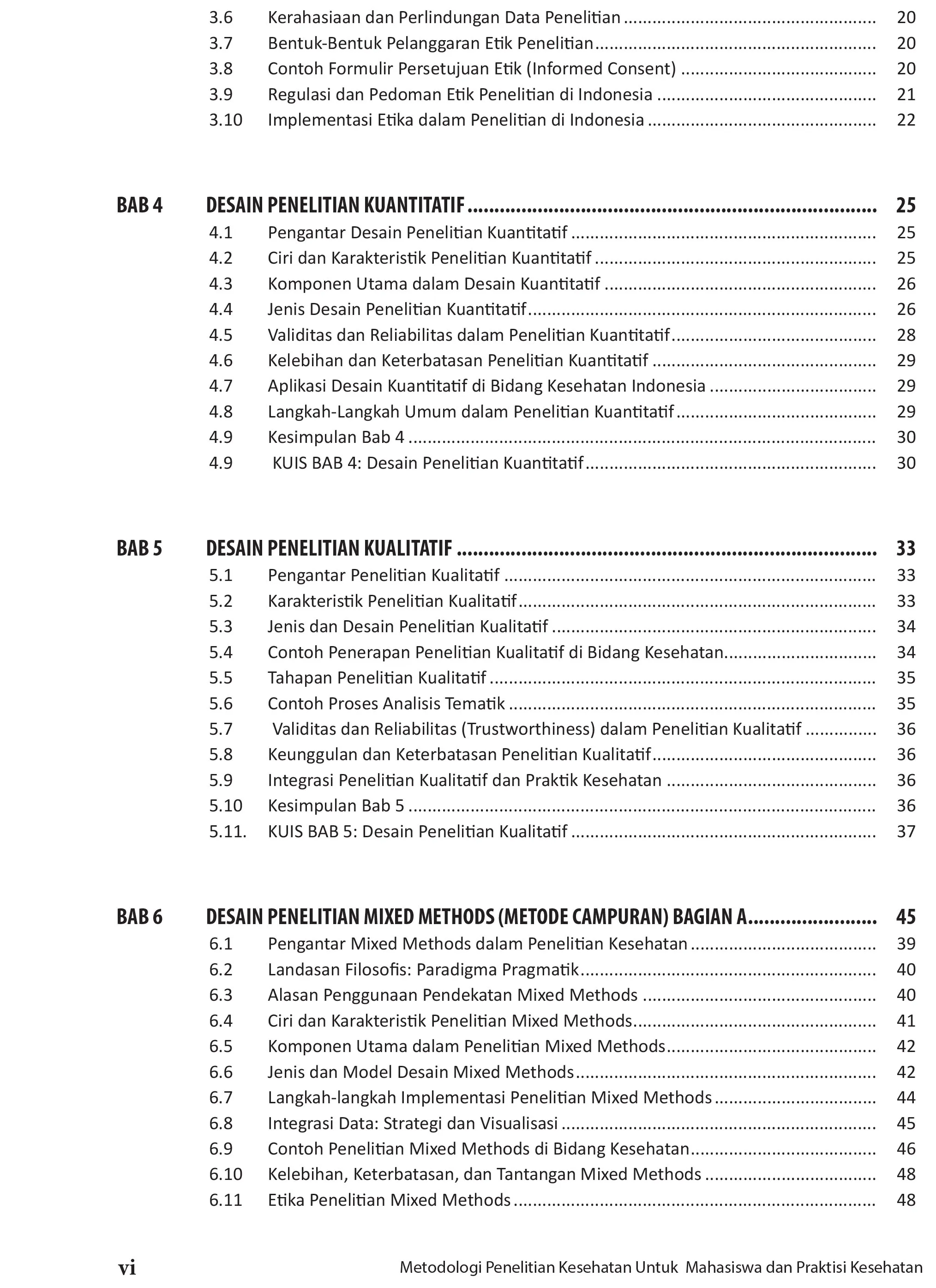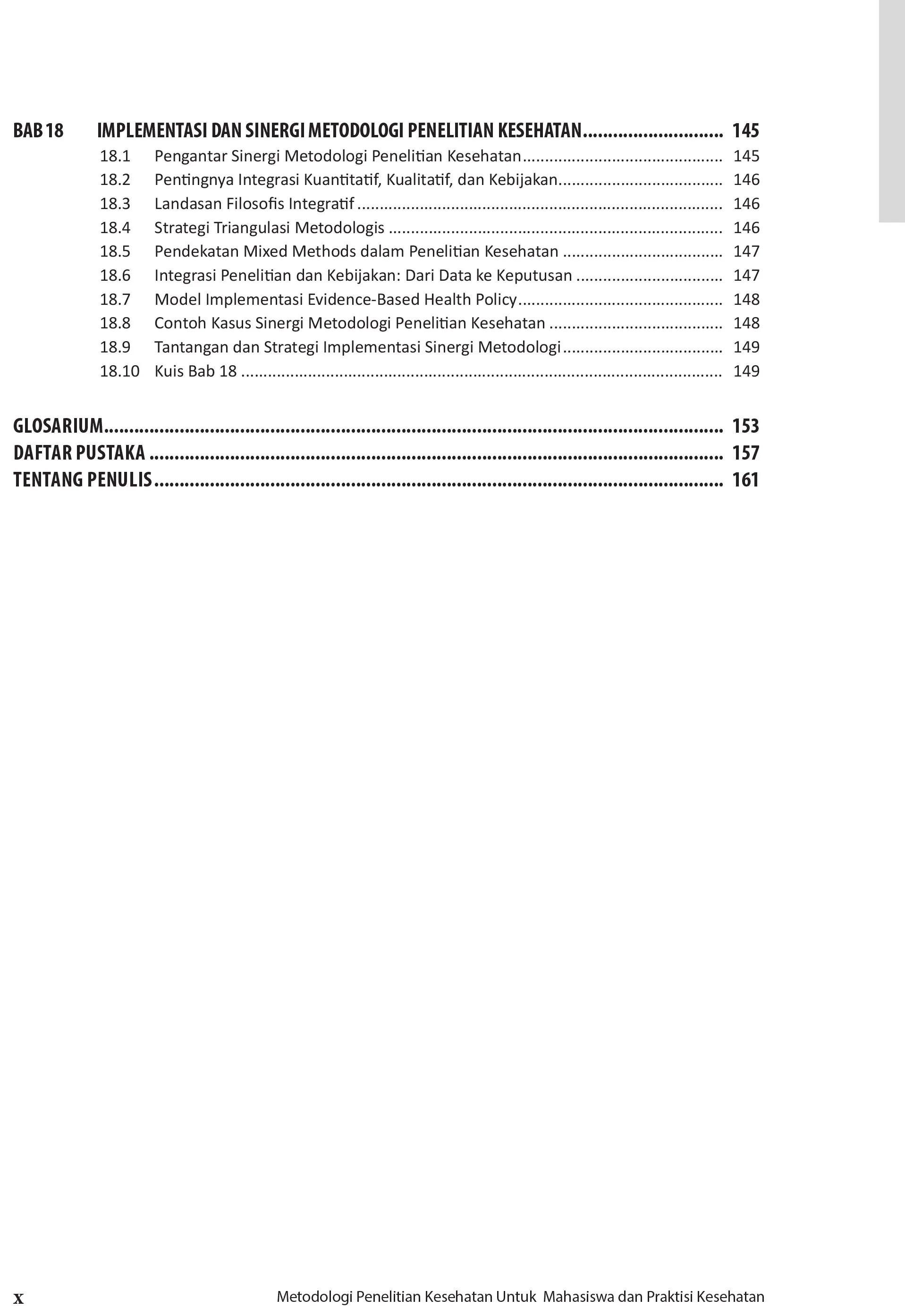 Buku Metodologi Penelitian Kesehatan: Panduan Lengkap Bagi Mahasiswa dan Praktisi Kesehatan hadir sebagai panduan komprehensif bagi mahasiswa, dosen, dan praktisi kesehatan dalam memahami, merancang, dan melaksanakan penelitian yang bermutu tinggi, etis, dan relevan dengan kebutuhan masyarakat serta transformasi sistem kesehatan Indonesia. Berangkat dari kebutuhan nyata dunia kesehatan — mulai dari rumah sakit, puskesmas, laboratorium, hingga lembaga kebijakan — buku ini menguraikan secara sistematis seluruh tahapan penelitian: dari perumusan masalah, penentuan desain, pemilihan instrumen, pengumpulan dan analisis data, hingga penyusunan laporan dan publikasi ilmiah. Keunggulan buku ini terletak pada kemampuannya mengintegrasikan pendekatan kuantitatif, kualitatif, dan kebijakan ke dalam satu kerangka metodologis yang adaptif dan aplikatif. Setiap bab diperkaya dengan contoh kasus nyata di bidang keperawatan, kebidanan, gizi, kesehatan lingkungan, dan rekam medis serta informasi kesehatan (RMIK)—mencerminkan praktik dan dinamika lapangan di Indonesia. Selain menjelaskan berbagai desain penelitian (deskriptif, analitik, eksperimental, evaluatif, pengembangan, dan kebijakan), buku ini juga memperkenalkan pembaca pada pendekatan riset modern seperti mixed methods, design-based research (DBR), action research, serta penerapan metodologi dalam digital health dan interoperabilitas sistem informasi (SIMRS, BPJS, SATUSEHAT). Untuk mendukung pembelajaran aktif, setiap bab dilengkapi dengan:
