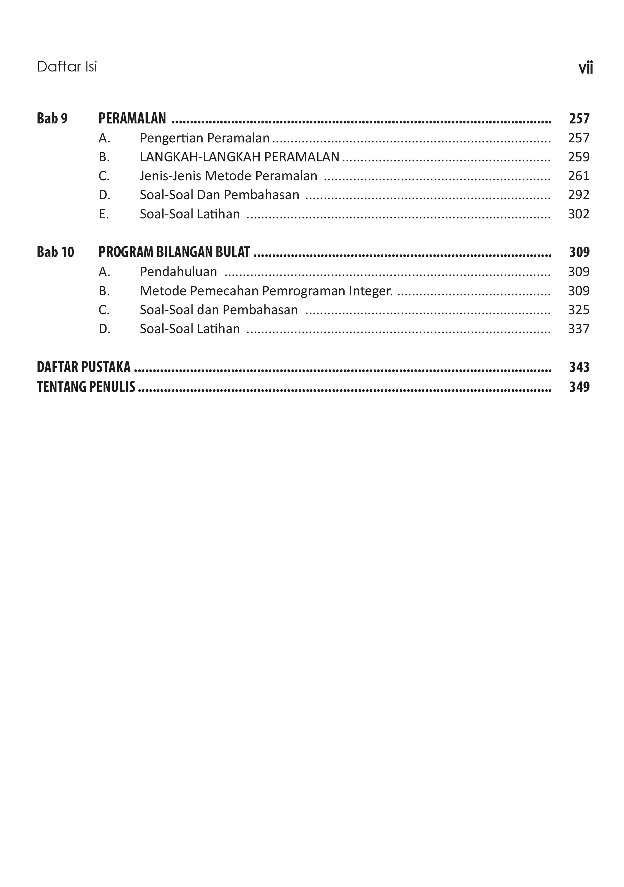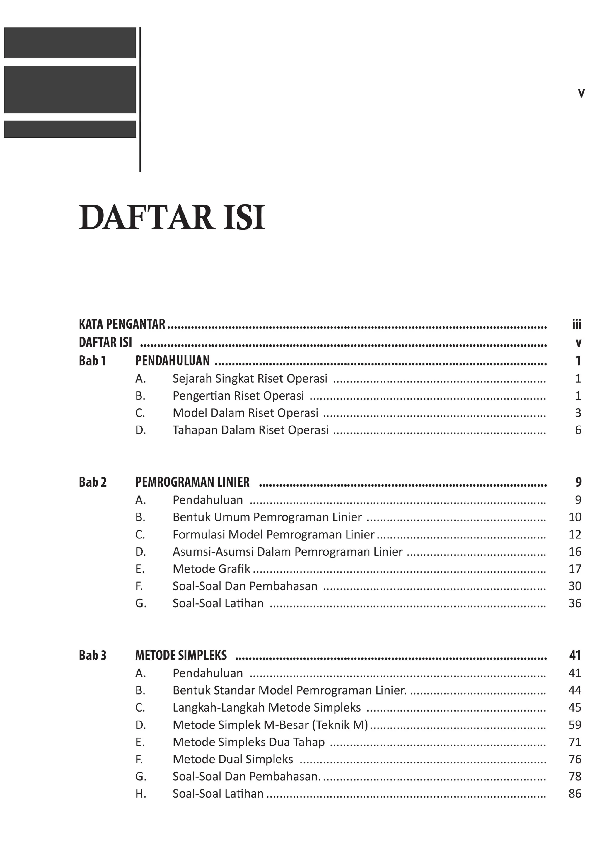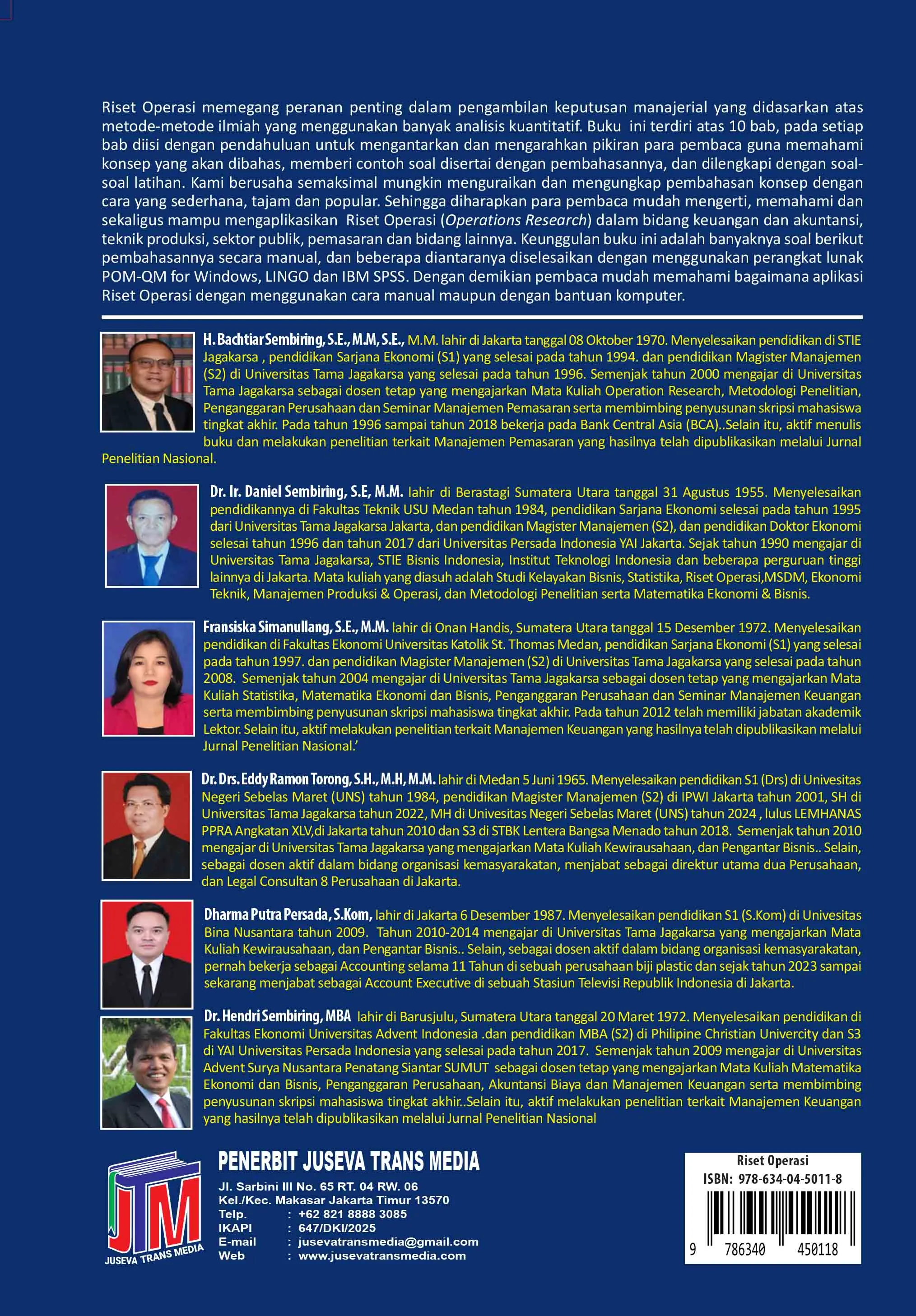 Riset Operasi memegang peranan penting dalam pengambilan keputusan manajerial yang didasarkan atas metode-metode ilmiah yang menggunakan banyak analisis kuantitatif. Buku ini terdiri atas 10 bab, pada setiap bab diisi dengan pendahuluan untuk mengantarkan dan mengarahkan pikiran para pembaca guna memahami konsep yang akan dibahas, memberi contoh soal disertai dengan pembahasannya, dan dilengkapi dengan soal-soal latihan. Kami berusaha semaksimal mungkin menguraikan dan mengungkap pembahasan konsep dengan cara yang sederhana, tajam dan popular. Sehingga diharapkan para pembaca mudah mengerti, memahami dan sekaligus mampu mengaplikasikan Riset Operasi (Operations Research) dalam bidang keuangan & akuntansi, teknik produksi, sektor publik, pemasaran dan bidang lainnya. Keunggulan buku ini adalah banyaknya soal berikut pembahasannya secara manual, dan beberapa diantaranya diselesaikan dengan menggunakan perangkat lunak POM-QM for Windows, LINGO dan IBM SPSS. Dengan demikian pembaca mudah memahami bagaimana aplikasi Riset Operasi dengan menggunakan cara manual maupun dengan bantuan komputer.