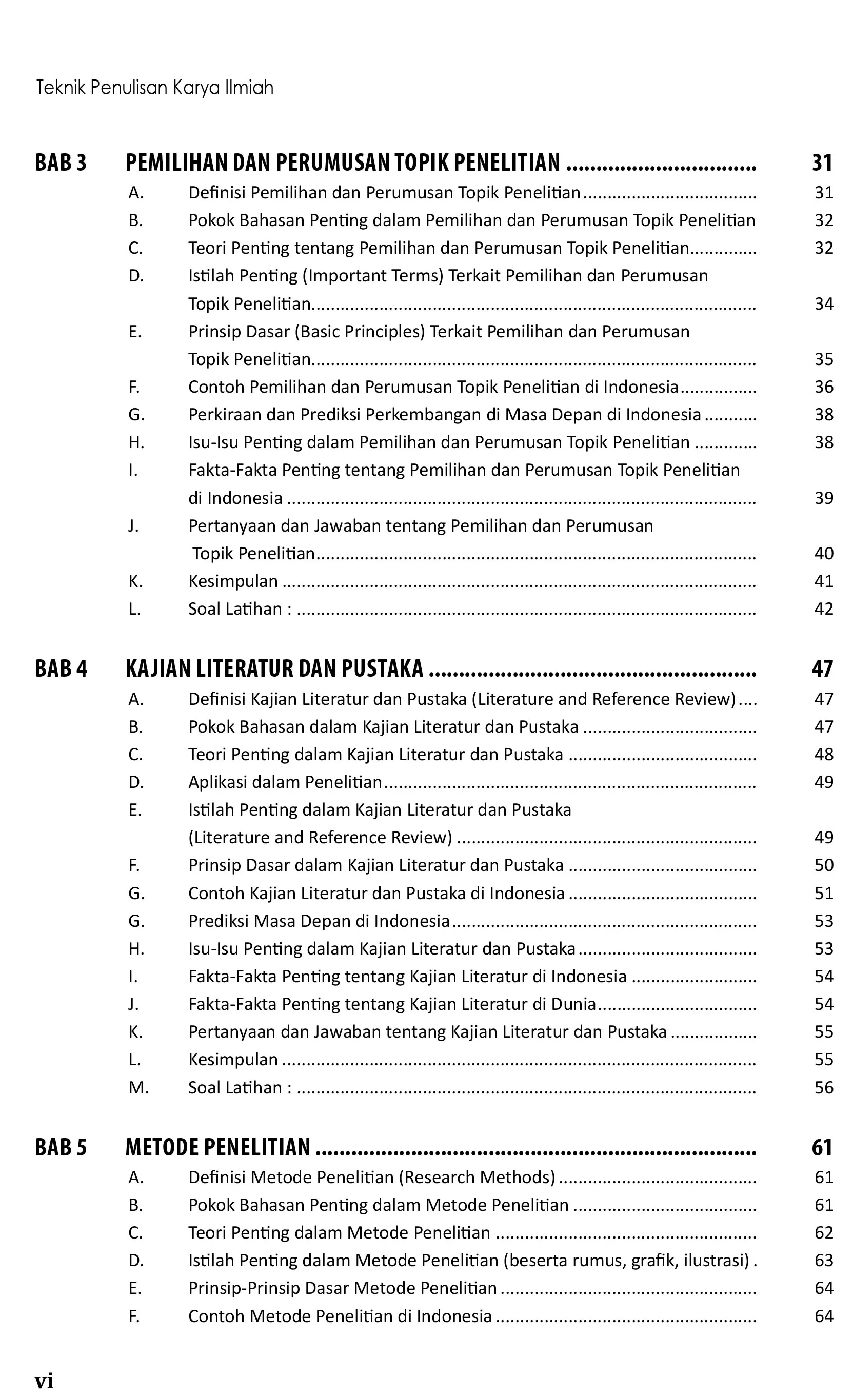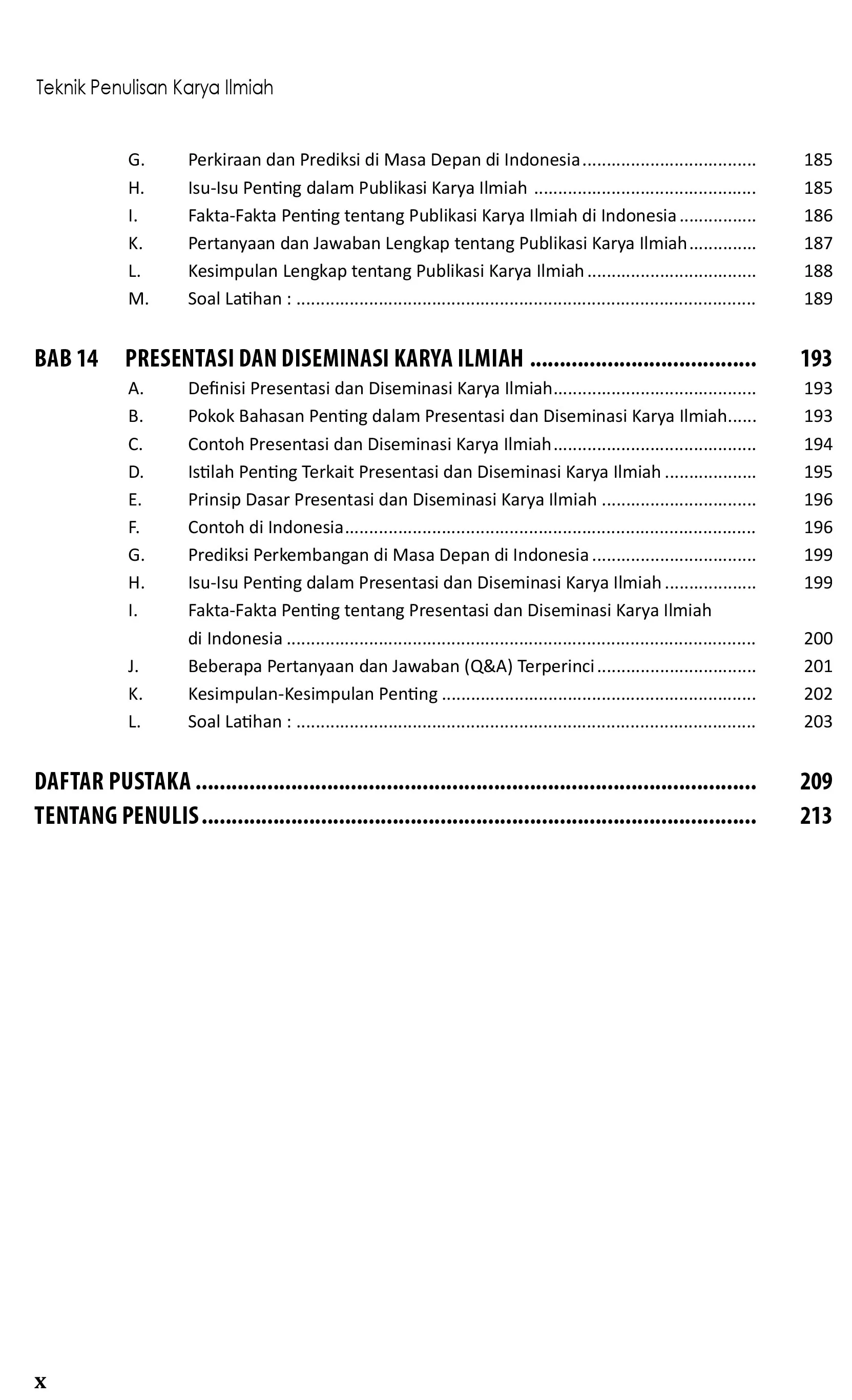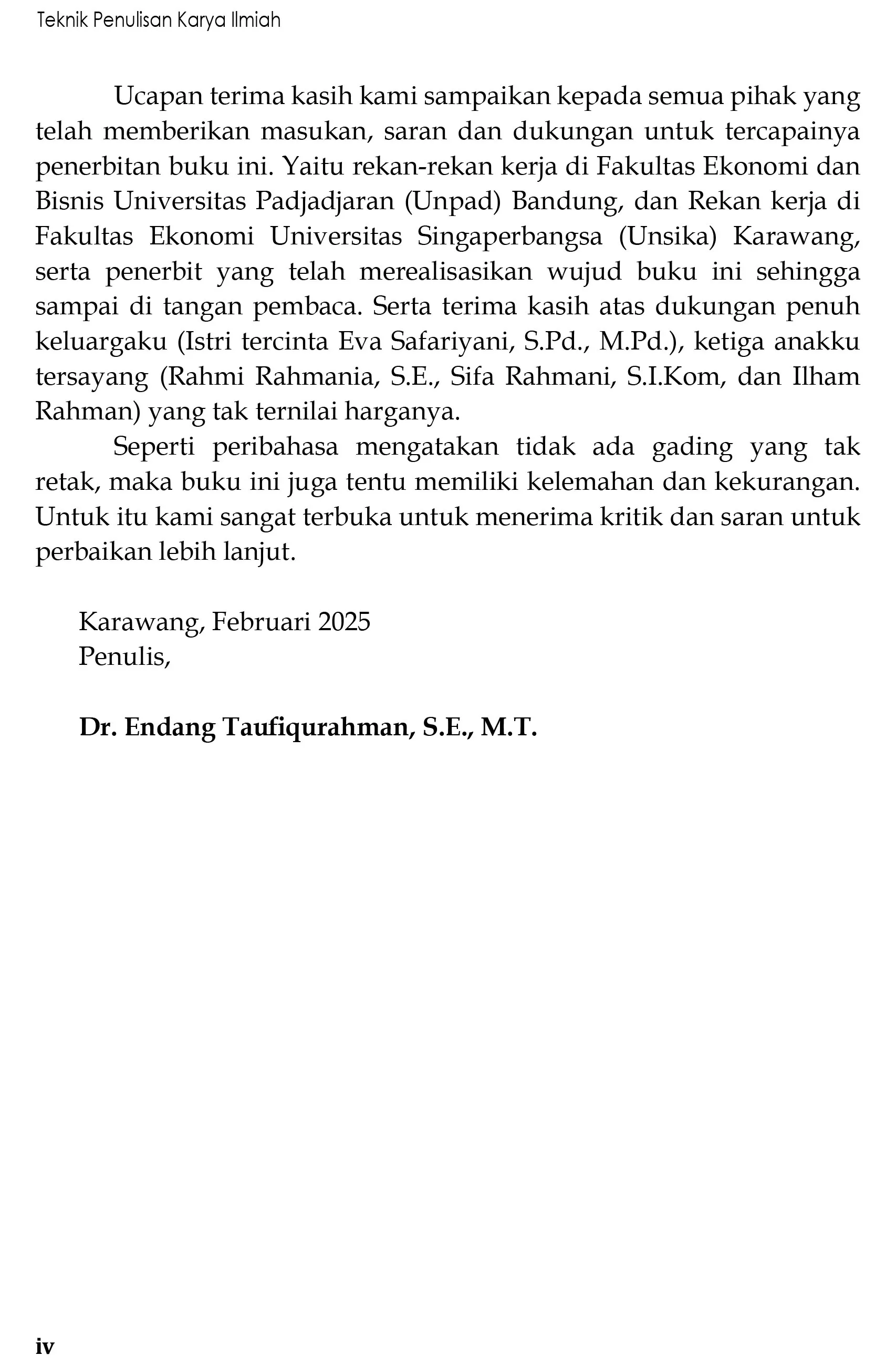 Karya ilmiah tidak bisa dipisahkan dalam dunia pendidikan. Karya ilmiah memiliki peranan yang sangat penting dalam perkembangan dunia pendidikan. Dalam ranah Perguruan Tinggi ada tiga aspek pengembangan tri dharma perguruan tinggi. Aspek tersebut antara lain bidang pendidikan, penelitian, dan pengabdian kepada masyarakat. Ketiga aspek bidang ini, tentunya memiliki kaitan yang erat dengan karya ilmiah. Buku Teknik Penulisan Karya Ilmiah ini membahas teori dan praktik dalam menyusun karya tulis yang memenuhi kaidah ilmiah. Buku-buku ini biasanya mencakup berbagai aspek, mulai dari pengenalan konsep dasar karya ilmiah, langkah-langkah penyusunan, struktur karya ilmiah, hingga etika penulisan. Bagian lainnya membahas langkah-langkah proses penelitian dari menentukan topik hingga menyusun laporan, serta etika penulisan ilmiah seperti menghindari plagiarisme dan memahami hak cipta. Bagian terakhir mengeksplorasi tren modern seperti digitalisasi, manajemen referensi dengan software, kolaborasi internasional, dan pengaruh media sosial. Buku ini adalah referensi esensial bagi siapa saja yang ingin meningkatkan kemampuan menulis ilmiahnya.