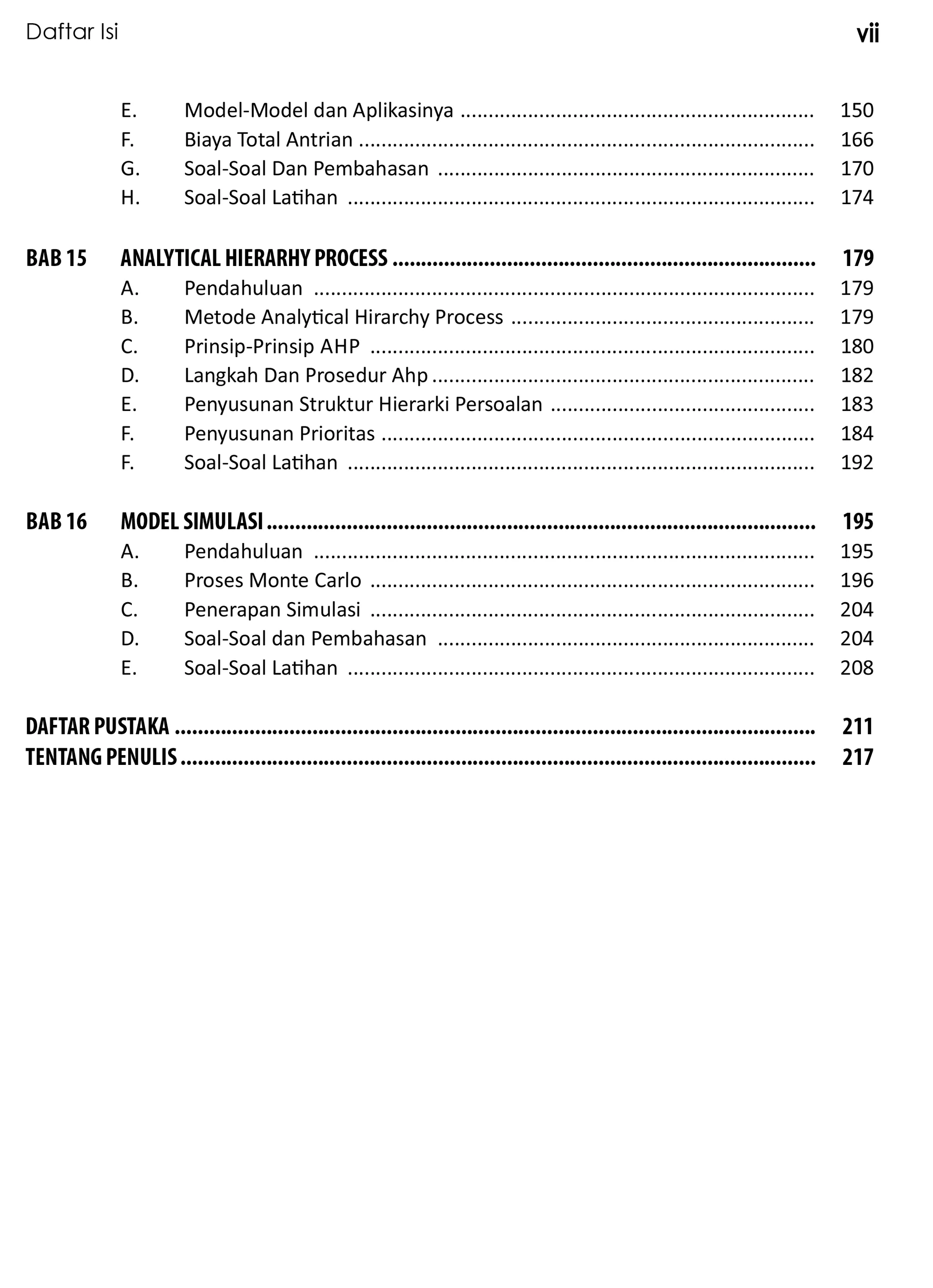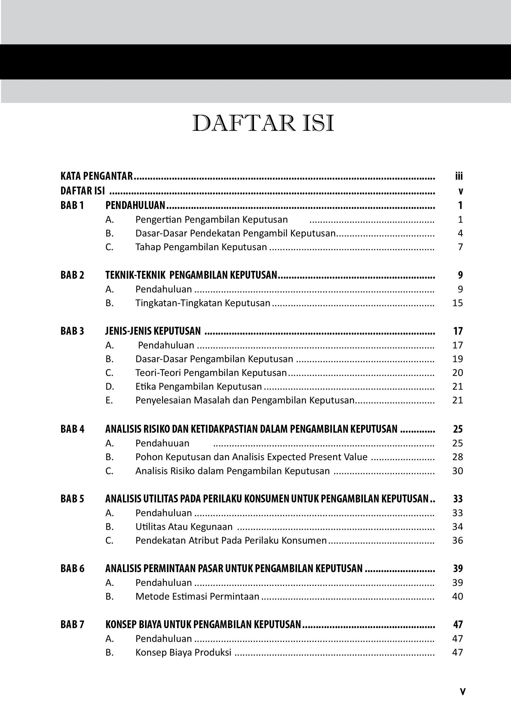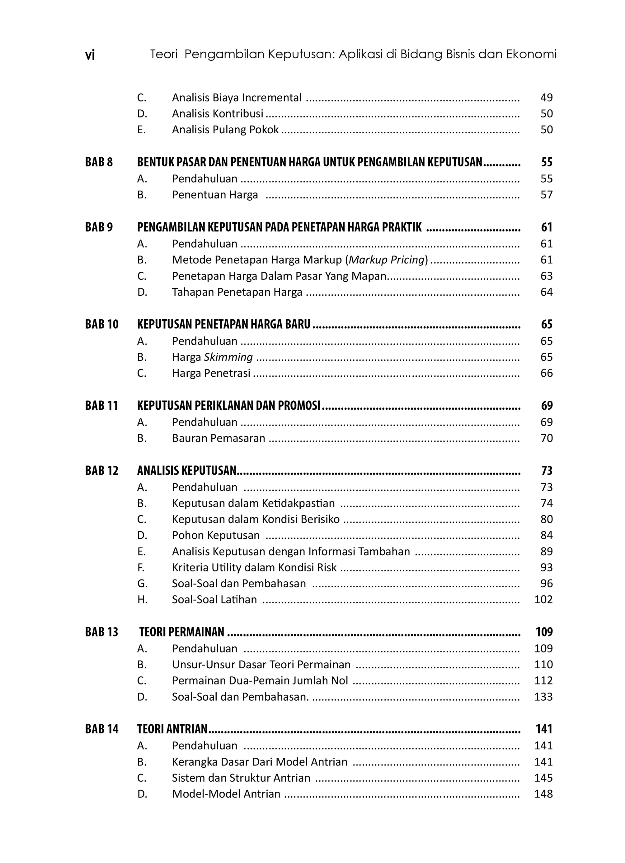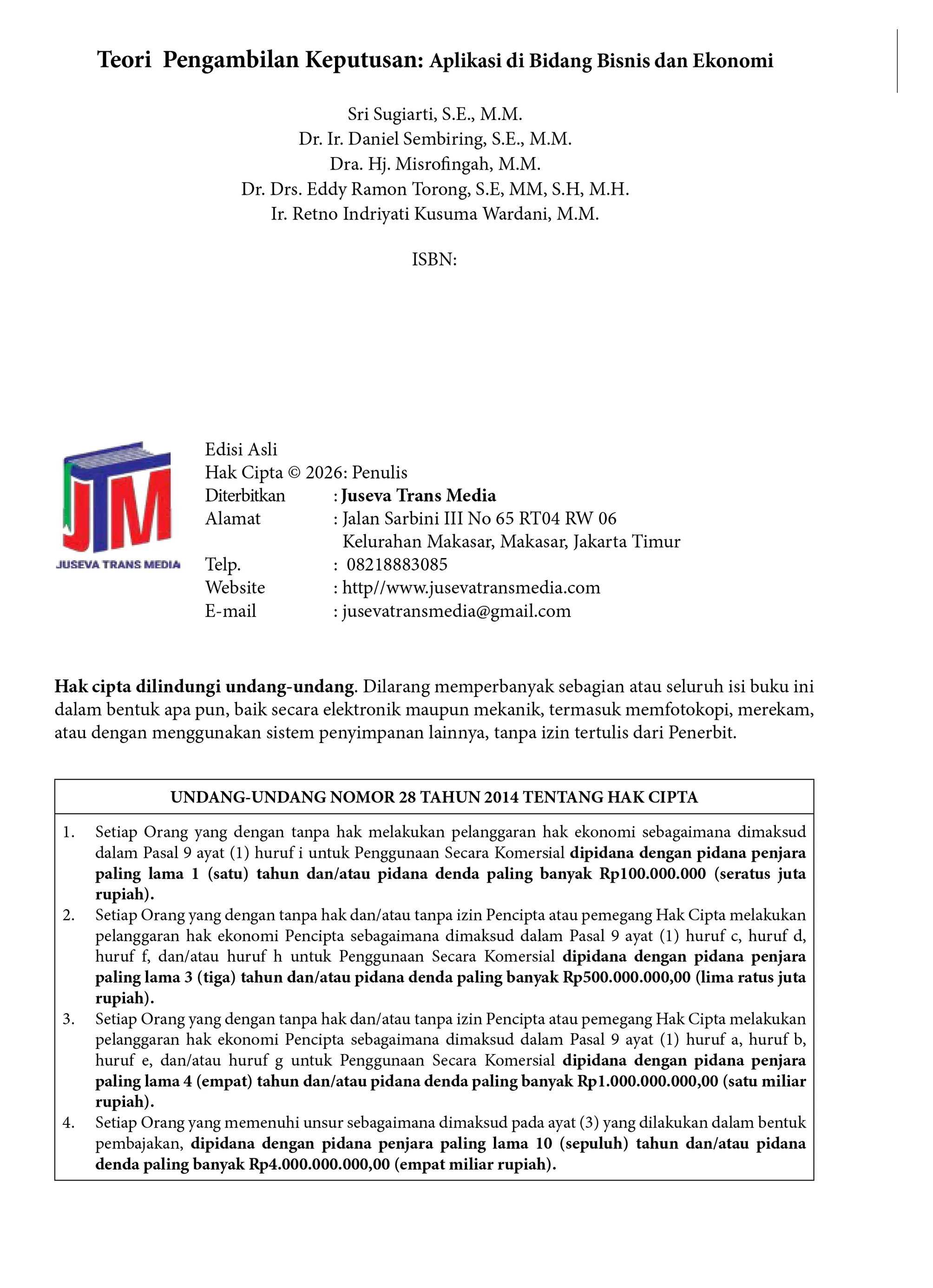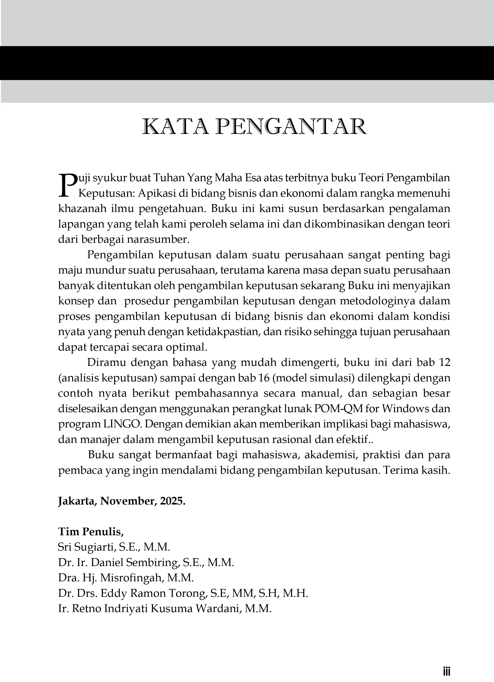 Pengambilan keputusan dalam suatu perusahaan sangat penting bagi maju mundur suatu perusahaan, terutama karena masa depan suatu perusahaan banyak ditentukan oleh pengambilan keputusan sekarang Buku ini menyajikan konsep dan prosedur pengambilan keputusan dengan metodologinya dalam proses pengambilan keputusan di bidang bisnis dan ekonomi dalam kondisi nyata yang penuh dengan ketidakpastian, dan risiko sehingga tujuan perusahaan dapat tercapai secara optimal. Diramu dengan bahasa yang mudah dimengerti, buku ini dari bab 12 (analisis keputusan) sampai dengan bab 16 (model simulasi) dilengkapi dengan contoh nyata berikut pembahasannya secara manual, dan sebagian besar diselesaikan dengan menggunakan perangkat lunak POM-QM for Windows dan program LINGO. Dengan demikian akan memberikan implikasi bagi mahasiswa, dan manajer dalam mengambil keputusan rasional dan efektif.